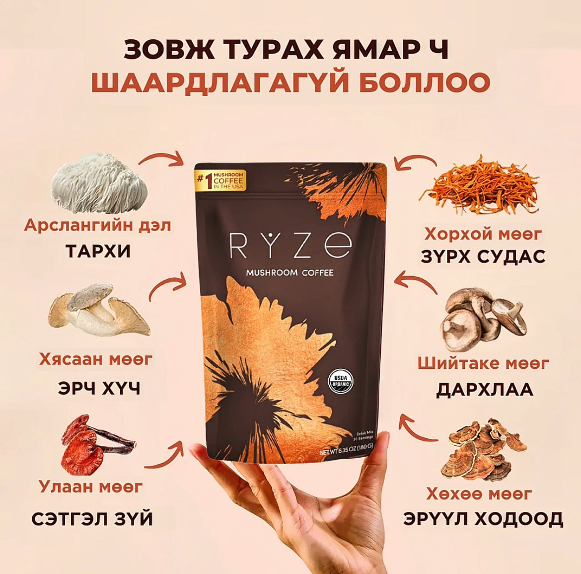 Манай бүтээгдэхүүн нойронд ямар ч сөрөг нөлөө байхгүй. Ryze мөөгтэй кофе нь энгийн кофеноос 2 дахин бага кафейны хэмжээ агуулдаг.